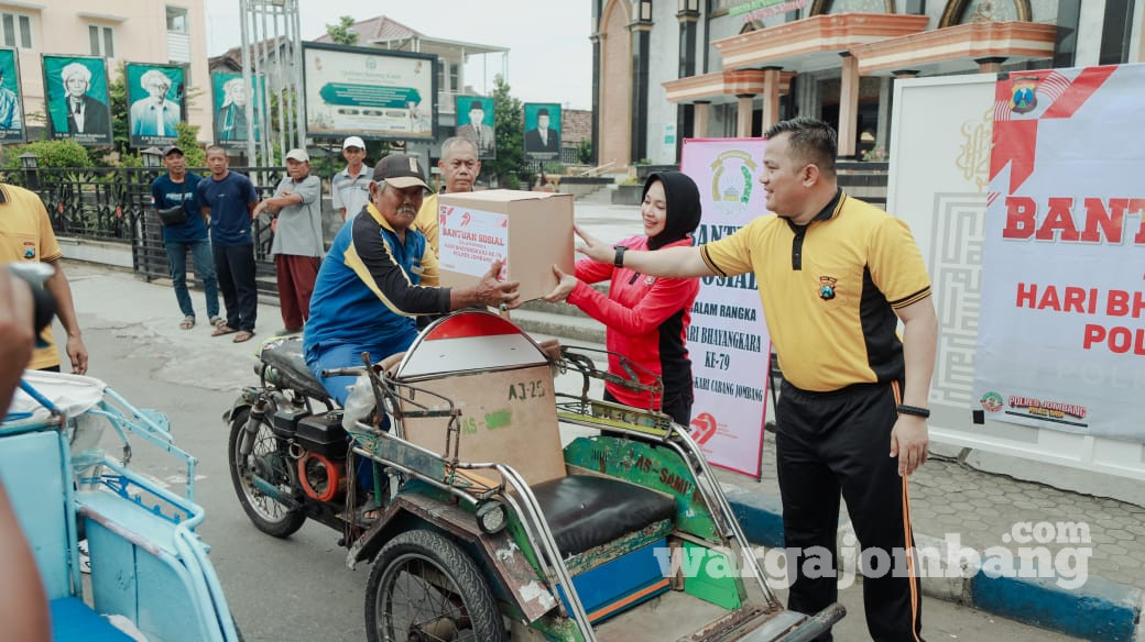 Jombang – Dalam rangka menyambut Hari Ulang Tahun Bhayangkara ke-79, Polres Jombang menggelar kegiatan bakti sosial dengan membagikan bantuan sosial (bansos) sembako kepada Juru Parkir dan Abang becak yang mangkal di sekitar Alun-Alun Jombang, Jum’at (13/6/2025).