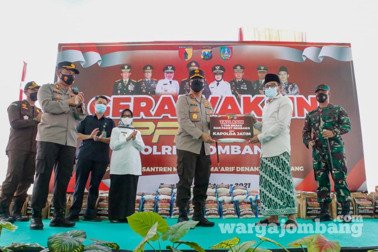 Jombang – Kapolda Jatim Irjen Pol Nico Afinta meninjau pelaksanaan vaksinasi COVID-19 di Pondok Pesantren Mambaul Maarif, Denanyar, Jombang, Rabu (6/10/2021). Pelaksanaan Vaksinasi COVID-19 di Ponpes Mambaul Maarif melibatkan 40 orang petugas gabungan TNI, Polri dan relawan. Sebanyak 2.000 santri akan disuntik vaksin COVID-19 dosis kedua. Dalam kesempatan itu, Kapolda juga menyerahkan bantuan berupa 1 ton beras kepada pihak pesantren. wargajombang/Ony
