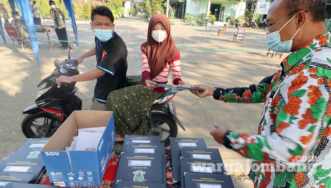 Mojowarno – Guru wali kelas menyerahkan penilaian hasil belajar kepada orangtua dan siswa saat pembagian raport secara ”drive-thru” di halaman SMP Negeri 1 Mojowarno, Kabupaten Jombang, Jumat (18/06/2021). Sekolah memilih cara tersebut untuk meminimalisir kerumunan di sekolah saat pengambilan raport. wargajombang/Ony.
